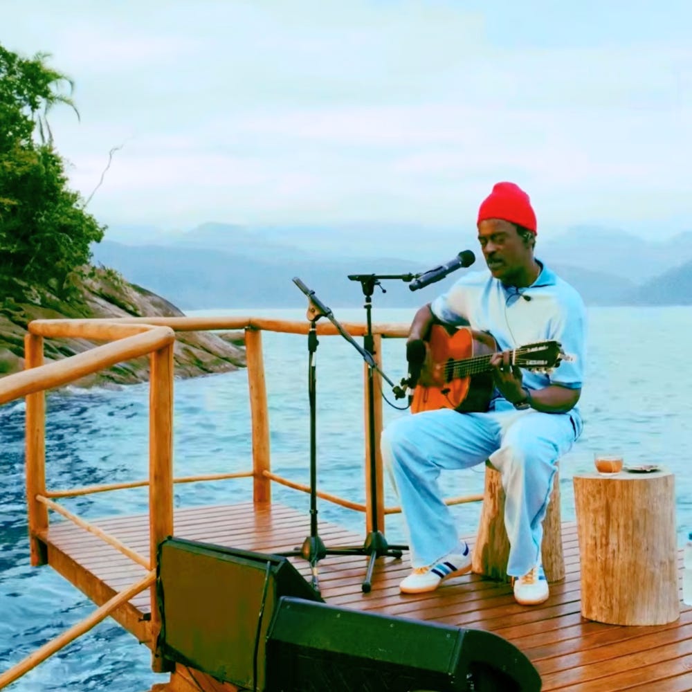 The setting is minimal - Jorge alone on the São Paulo coast, acoustic guitar, no audience. It was recorded during COVID lockdown in 2020 and only released last month. At one point, paddle boarders come ashore and sit down to listen (we have no idea if it was planned or not but it adds a lovely dimension).